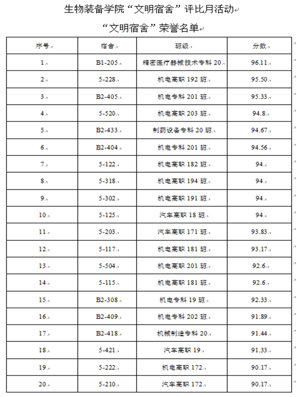 本次“文明宿舍”评比月活动的主题为“文明宿舍 向我看齐”,活动共分为两个阶段,第一阶段为“文明宿舍”评比准备阶段,此阶段以班级为单位,由班主任老师、班级干部带领本班同学对宿舍进行集中指导和整理,本阶段各班级认真组织、积极准备,班主任老师以现场督查、线上监督等方式在“文明宿舍”评比准备阶段每天对本班宿舍进行关心和指导,并选出参评宿舍。第二阶段为“文明宿舍”综合评比阶段,由学院领导、班主任老师、宿管老师及学生干部对参评宿舍分别从清洁、整洁、美化三个方面进行综合打分,从而选出本次活动的“文明宿舍”。经过一天的评比检查,并结合10月份、11月份两个月的公寓管理成绩,最终精密医疗器械技术专科20班B1-205宿舍等20个宿舍获得本次活动的“文明宿舍”称号。