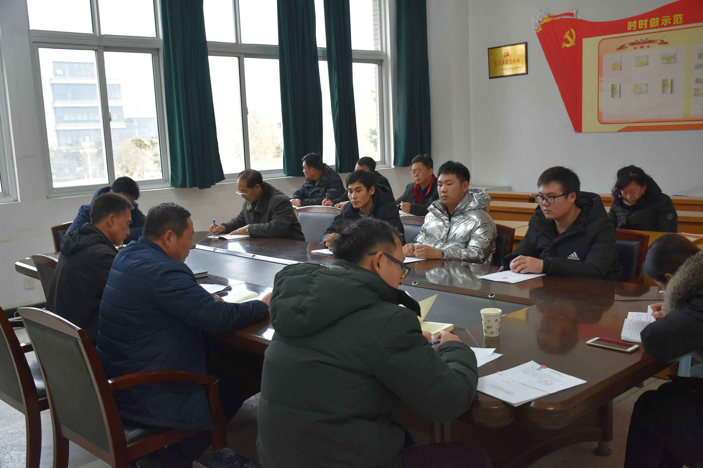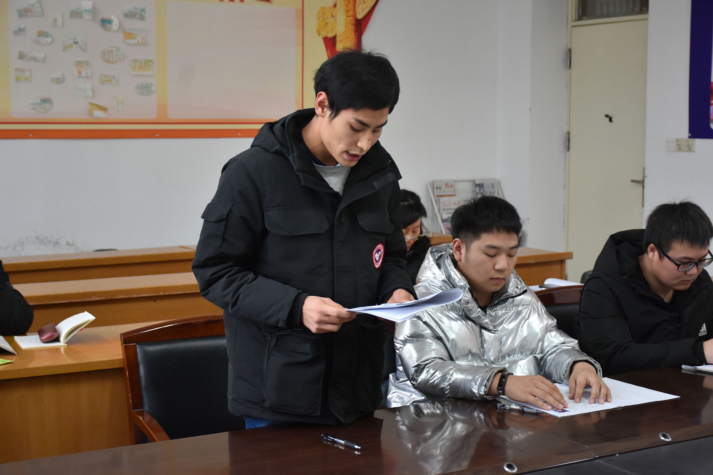 三名拟接收对象为王阳、闫九海、王朝,会议按照接收流程依次进行。首先由拟接收为预备党员的同志向党组织汇报了自身基本情况,宣读入党志愿书。杨海亮同志代表支委会向大会报告四位同志的审查情况,随后,入党介绍人如实介绍了各自联系的发展对象情况,并对其能否入党表明意见,与会党员充分讨论并发表了意见。经大会票决,支部与会正式党员全票同意接收四位同志为预备党员。杨海亮同志宣读支部大会决议,王阳等三位同志做表态发言:感谢支委会和全体支部党员的信任,我们将不忘入党初心,加强政治学习,时刻以党员的标准严格要求自己,主动接受党组织考察、批评。