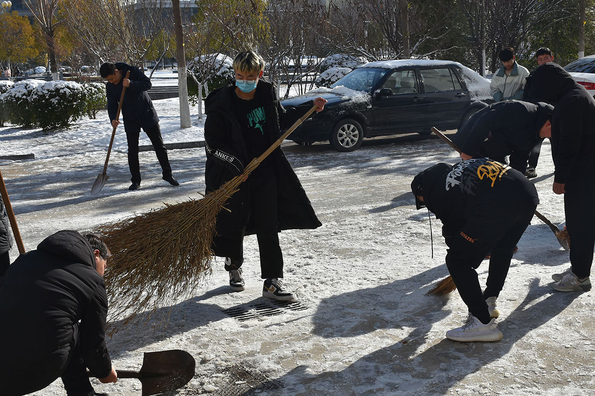 12月29日,一场大雪悄然而至,整个校园一片银装素裹,一片冬日雪后的美丽景色。但是伴随而来的道路路面出现大面积积雪和冰冻,对全院师生的出行造成了较大的影响。为及时清扫积雪,确保校园道路交通安全和方便师生出行。12月30日上午10时,生物装备学院学工党支部自发组织起来,在学院院长史先焘、党总支副书记史少伟带领下对机电实训楼附近的道路开展积雪清扫工作。