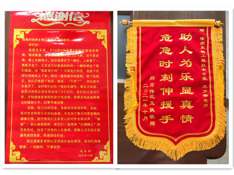 沈玉侠女士,江苏省丰县人。10月2日凌晨在家中突发疾病,情况危机,其丈夫和女儿背起她飞奔小区门口,寻车等待救援。因是凌晨街上车少人稀,好不容易拦下一辆车,车主看情况危急开走了。适逢史少伟老师开车路过,他停车见病人情况危机,就毫不犹豫的下车将其一家三口扶上车,一路狂奔及时送往医院。在帮助病人入院得到及时救治后,史老师悄悄离开了医院。沈女士有心的女儿拍下了史老师的车牌号。待妻子病情好转后,闫先生这才想起了危机时刻伸援手救助亲人的恩人。几经周折才通过丰县公安局段警官找到了徐州生物工程职业技术学院。这才有了11月17日下午的这一幕。