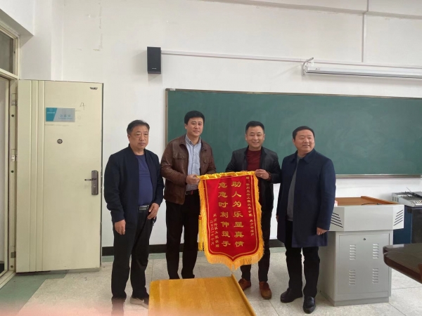 11月17日下午,生物装备学院二楼会议室迎来两位特殊的客人,一位是来自丰县凤城镇的闫宏伟,一位是来自丰县公安局治安大队的段超群。他们代表沈玉侠女士将一面印有“助人为乐显真情,危急时刻伸援手”的锦旗和感谢信送到生物装备学院党总支部,以表达对史少伟老师危机时刻伸援手救助亲人的感激之情。校工会主席李德志、办公室综合科科长黄志平与院党总支书记王开德接待来访客人。