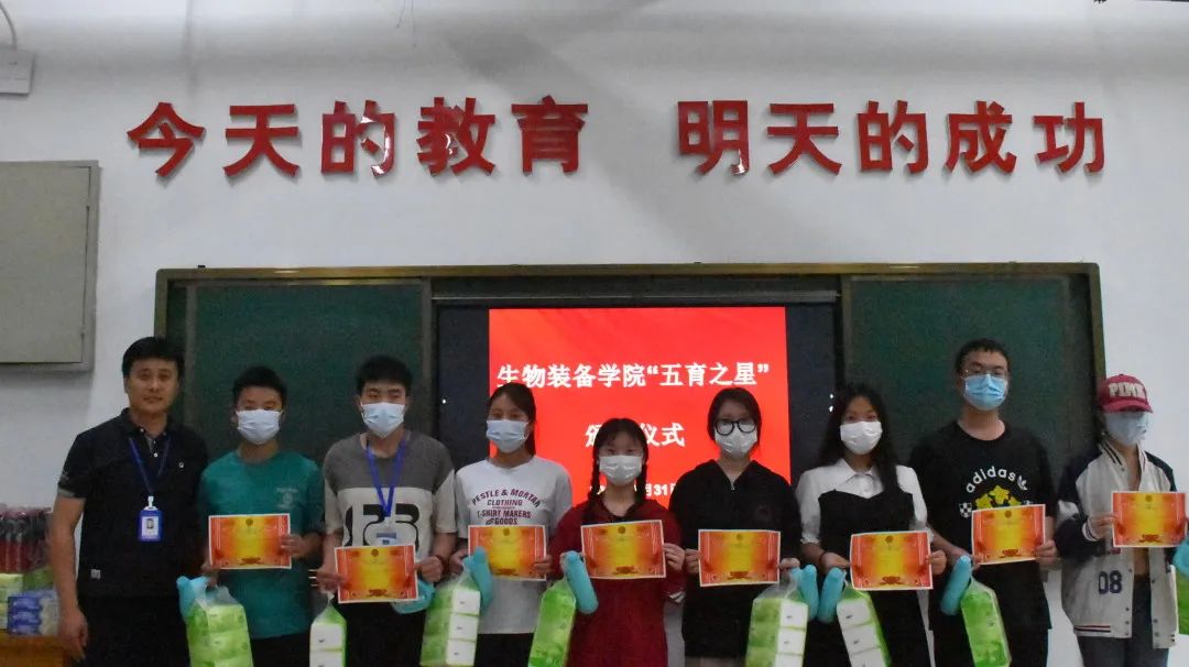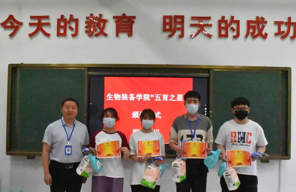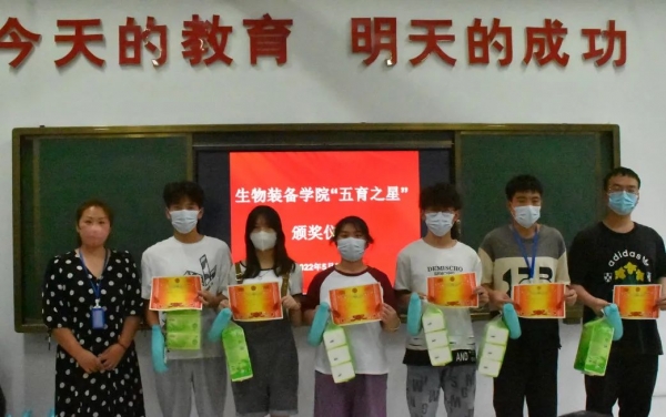 为提升学生的德、智、体、美、劳全面发展,有效推进“五育并举”目标的落实,5月31日下午,我院举行“五育之星”颁奖仪式。参加本次颁奖仪式的老师有生物装备学院党总支书记王开德、院党总支副书记史少伟、学生科科长杨海亮、辅导员张梅。本次颁奖仪式由第三届学生会主席苌子琪主持。首先由王开德致辞,他肯定了同学们的优秀表现,表达了对同学们的殷切期望,希望受表彰的同学再接再厉,其他同学要以受表彰的同学为榜样,刻苦努力,争创一流。